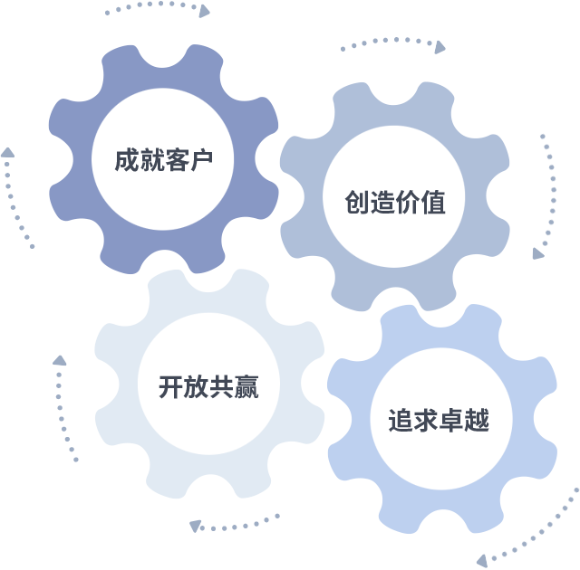 成就客户是一切决策的出发点,创造价值是衡量所有工作的标准,追求卓越是万博做事做人的态度,开放共赢是万博的格局也是最终的结果。价值观的齿轮环环相扣,推动着组织里的每个人不断向前。